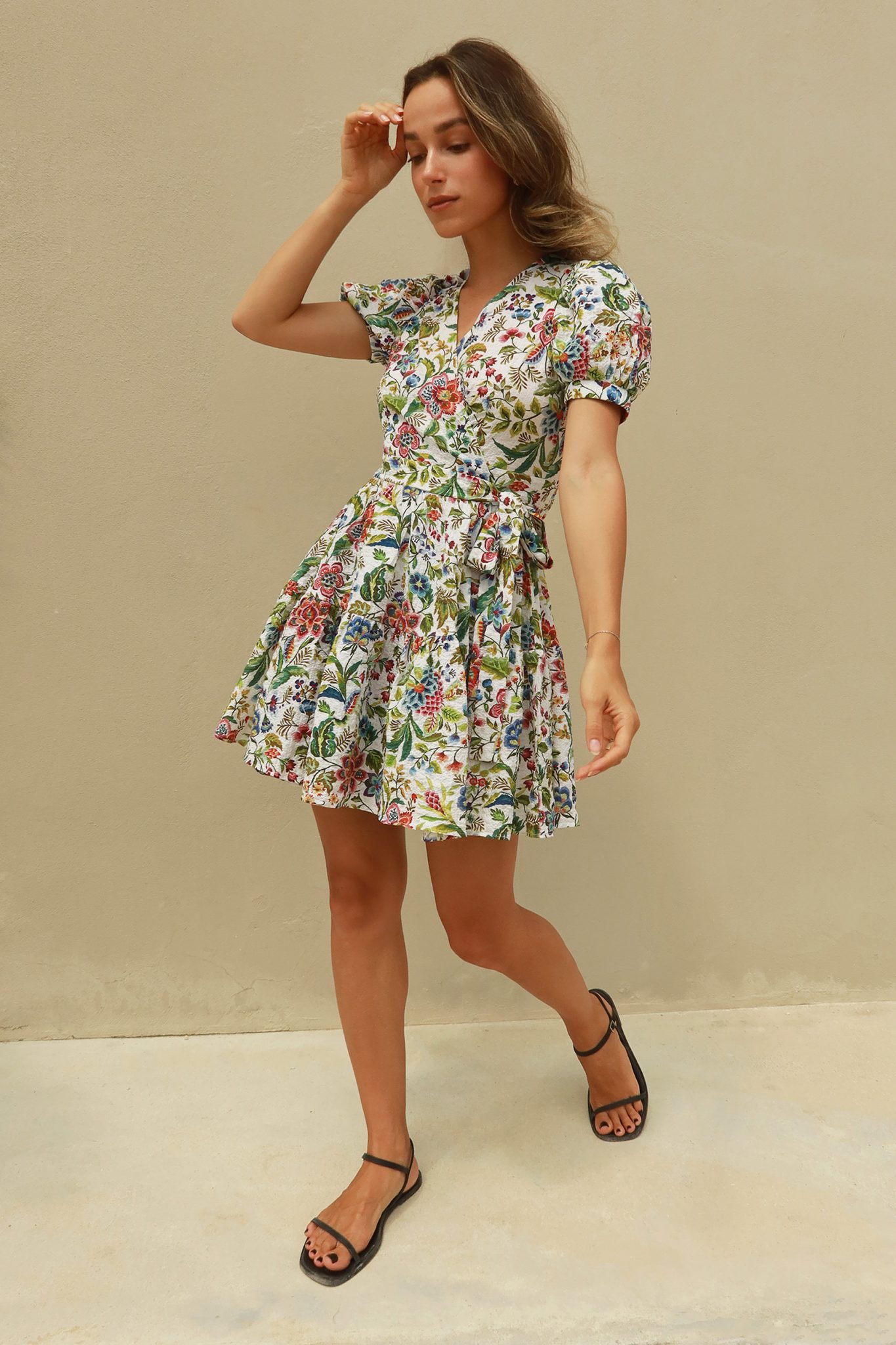 Lillelise mustriga minikleit puhvis varrukatega.